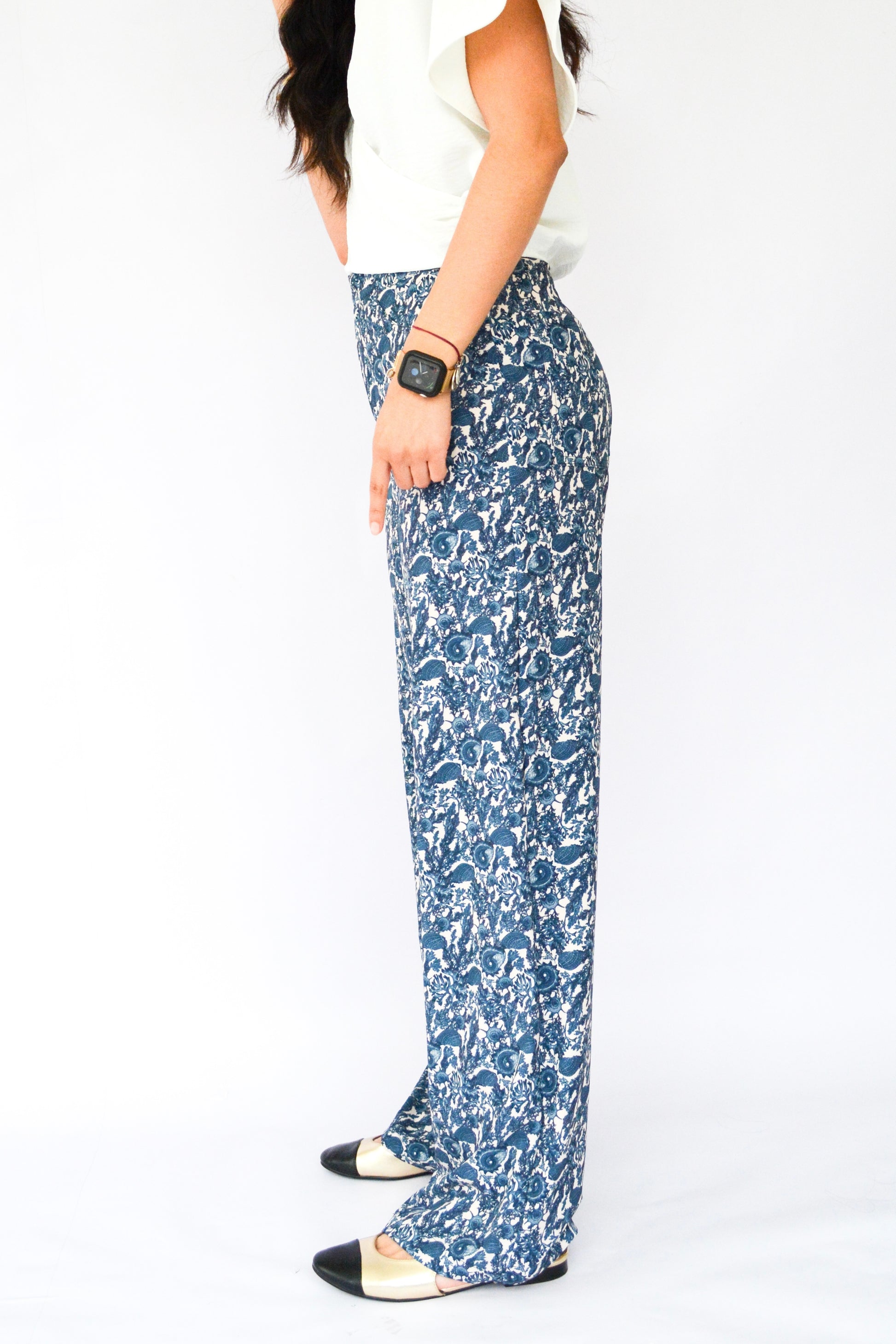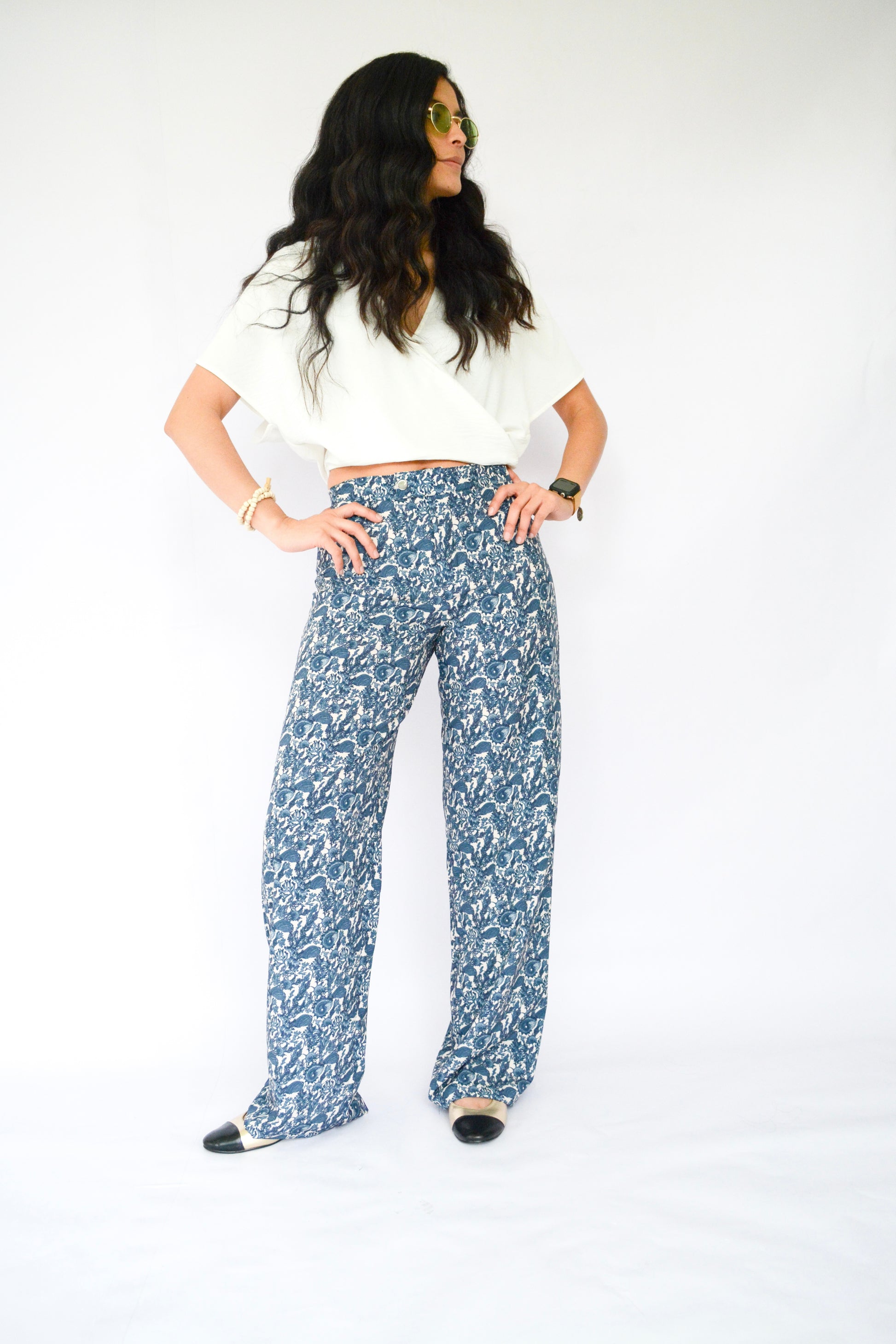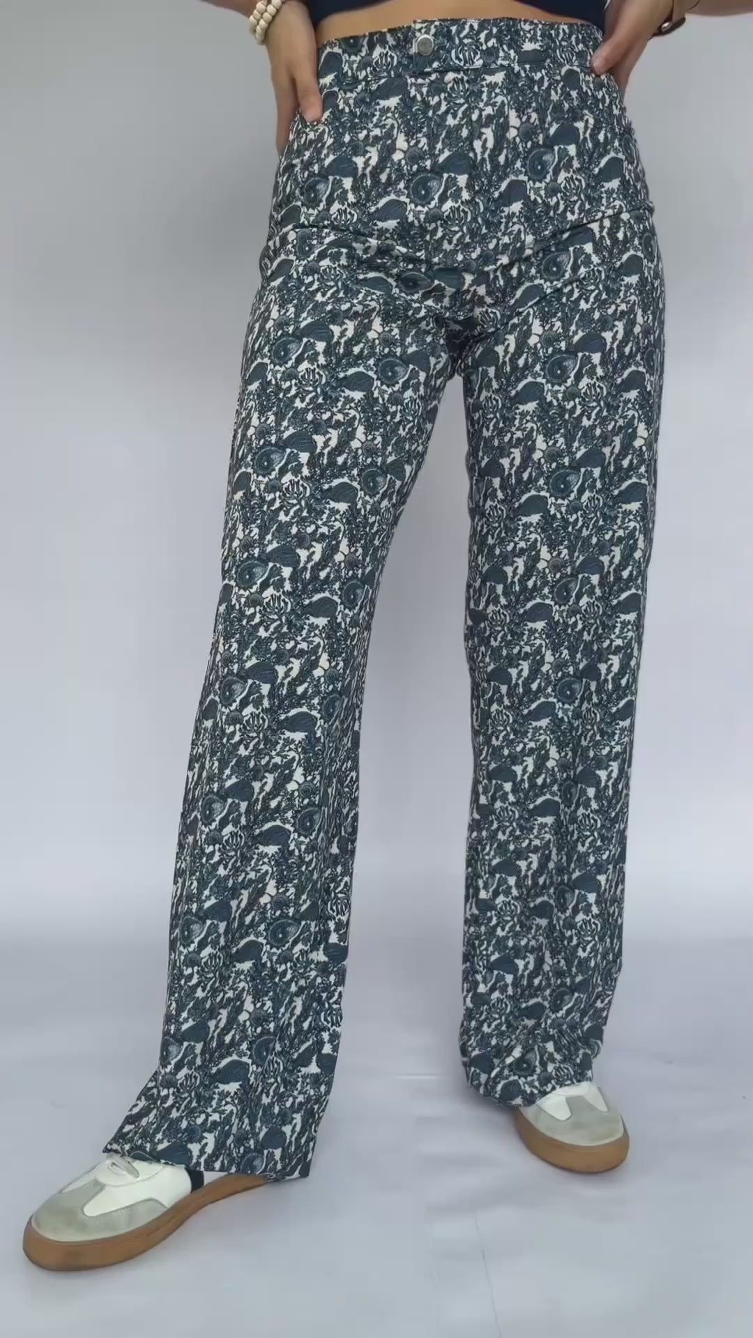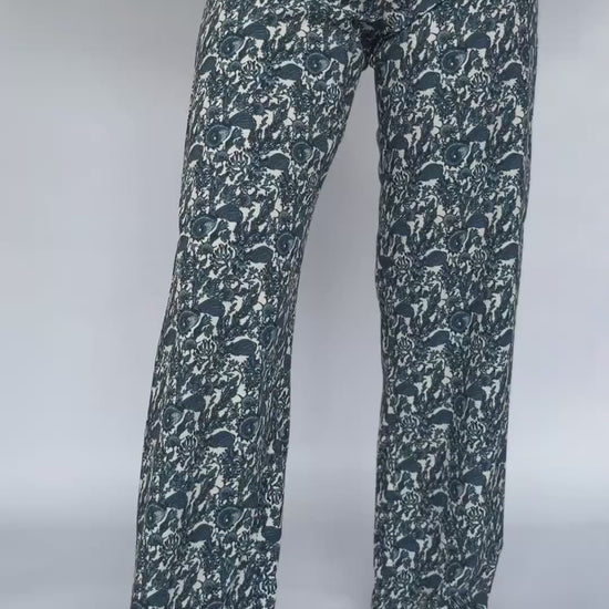 Pantalón estampado de seda de alta calidad, estampado de vegetación marina. Con una horma cómoda y femenina, su tela fluida proporciona un movimiento elegante. Con un corte tipo wide leg, cuenta con cremallera y broche en la pretina y prácticos bolsillos posteriores. Perfecto para diversas ocasiones y condiciones climáticas.