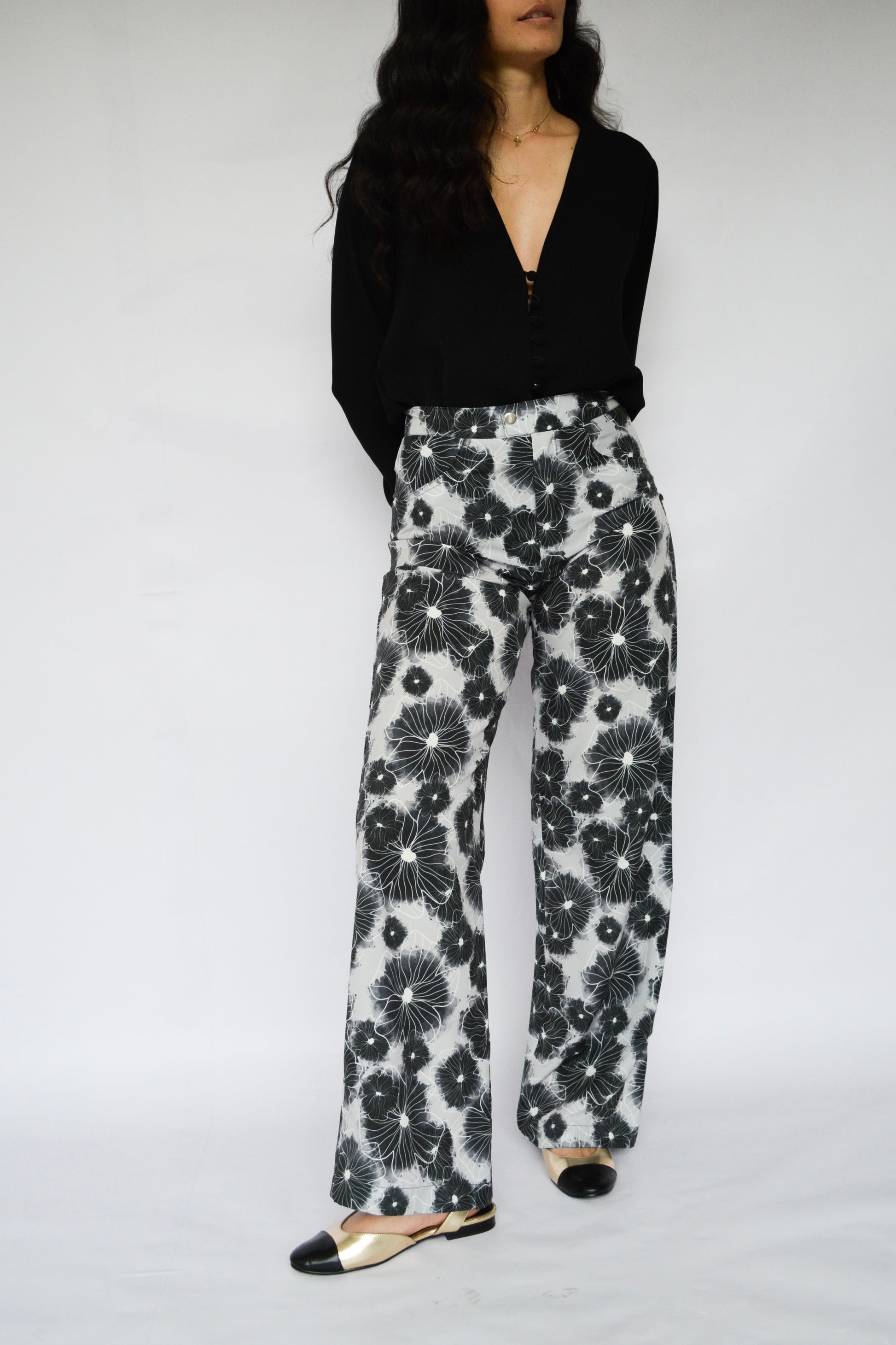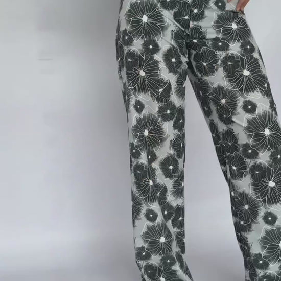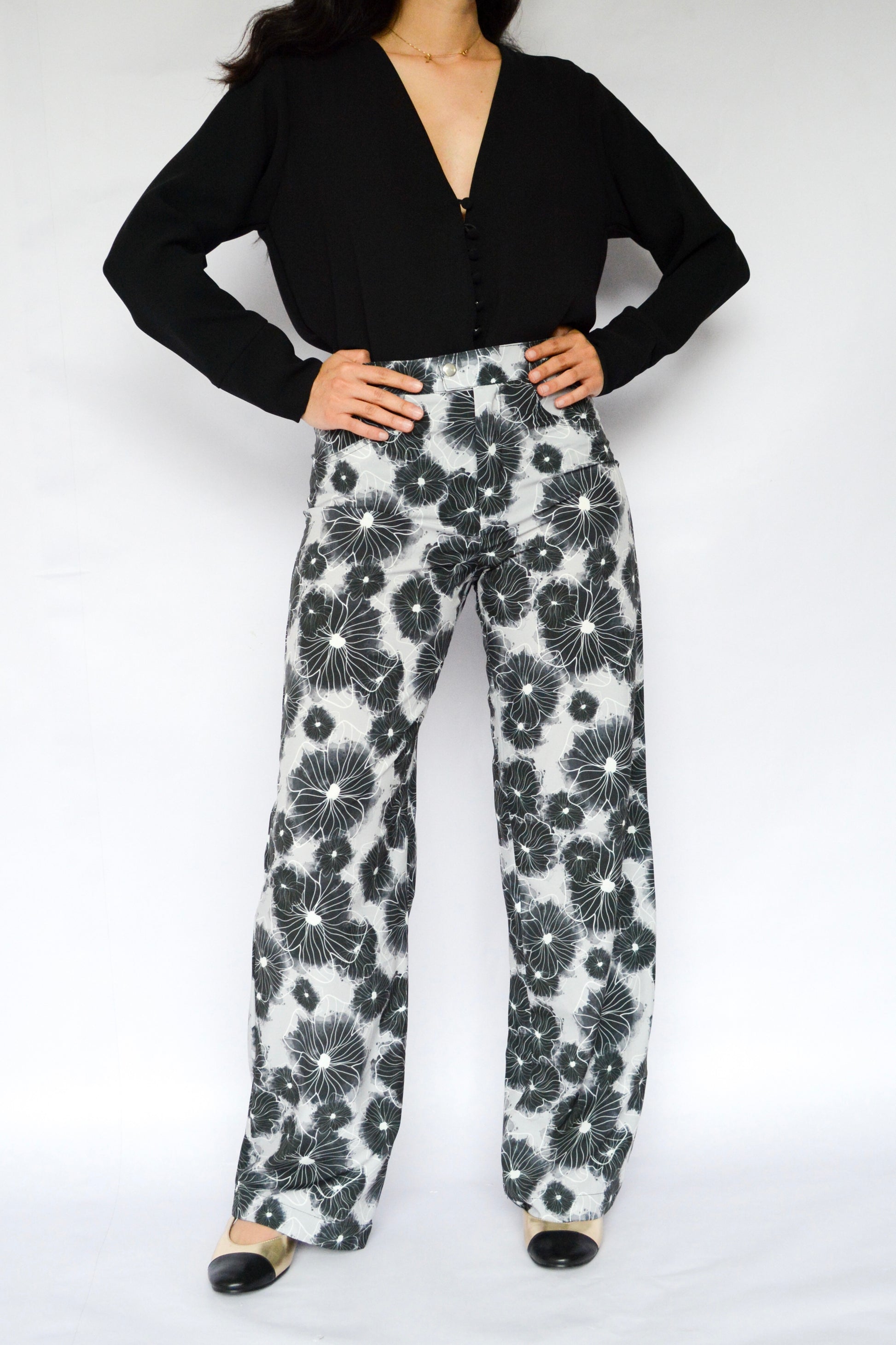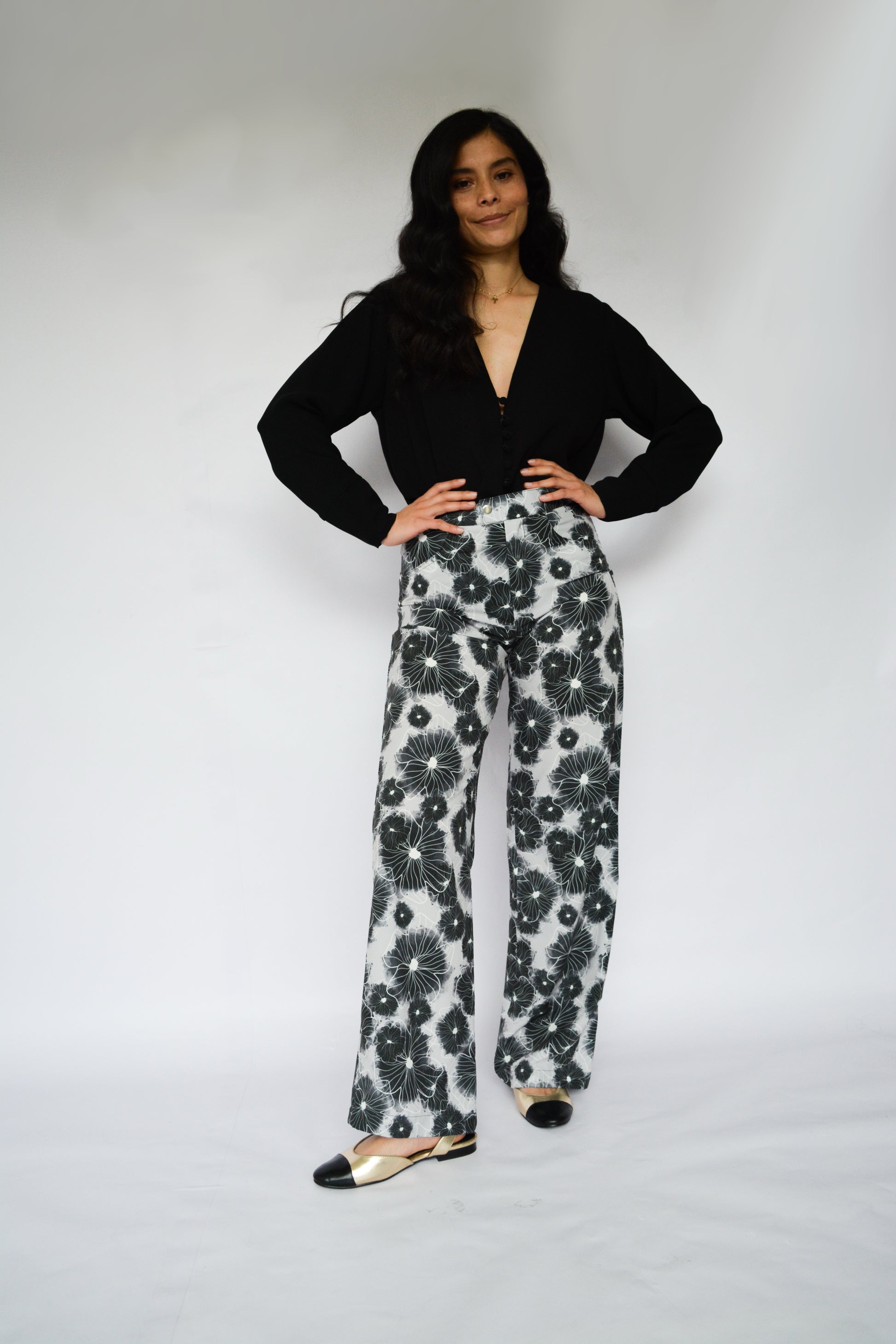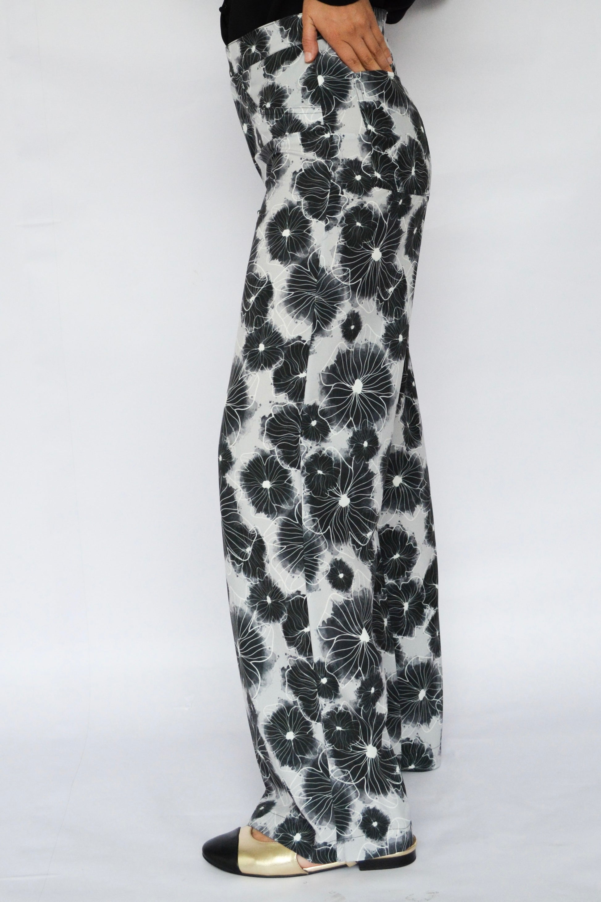Pantalón estampado de seda de alta calidad, inspirado en la rosa mística o flor zinnia. Con una horma cómoda y femenina, su tela fluida proporciona un movimiento elegante. Con un corte tipo wide leg, cuenta con cremallera y broche en la pretina y prácticos bolsillos posteriores. Perfecto para diversas ocasiones y condiciones climáticas.